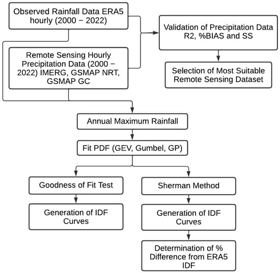 The primary goal of this research was to create IDF curves for three major cities in Iraq and extend the method for developing IDF curves at ungauged areas using satellite rainfall. Figure 3 shows the flowchart elaborating the specific technical steps followed to fulfil the objectives. The goal was accomplished by performing the procedures listed below.