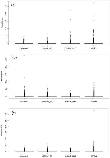 Box plot of in situ and satellite daily rainfall during 2000–2015 at (a) Baghdad, (b) Musol, (c) Basrah.