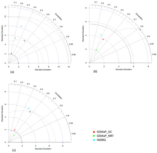 Taylor diagram of in situ and satellite daily rainfall during 2000–2015 at (a) Baghdad, (b) Musol, (c) Basrah.