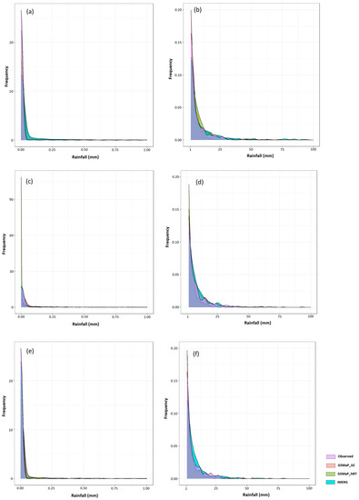 Distribution plots of in situ and satellite daily rainfall data at Baghdad (a,b), Mosul (c,d), and Basrah (e,f).