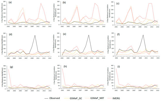 Annual rainfall maxima of in situ and satellite daily rainfall data for 1-, 2-, and 3-days at Baghdad (a–c), Mosul (d–f), and Basrah (g–i).