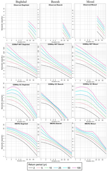 Observed daily datasets and satellite-based precipitation datasets were used to generate IDF curves at all three major cities using the MLE-estimated GEV distribution parameters. Figure 8 illustrates the IDF curves produced using IMRG, GSMAP NRT, GSMAP GC, and the observed dataset. This study assessed the performance of satellite IDF curves based on the return durations of observed dataset 24-, 48-, and 72-h rainfall intensities. The results showed that the IDF curves of all products were significantly different from the hourly IDF curve estimated using the observed dataset, except for GSMaP GC. In Baghdad, the observed 100year return rainfall for 24-, 48-, and 72-h duration was 3.8, 2.7, and 2.0 mm/h, respectively. The GSMaP GC estimated those 5.5, 2.7, and 1.6 mm/h. In contrast, GSMaP NRT estimations were 22.0, 10.0, and 6.5 mm/h. All products severely overestimated the IDF curve at Baghdad, except GSMaP GC, which slightly underestimated the IDF curves.