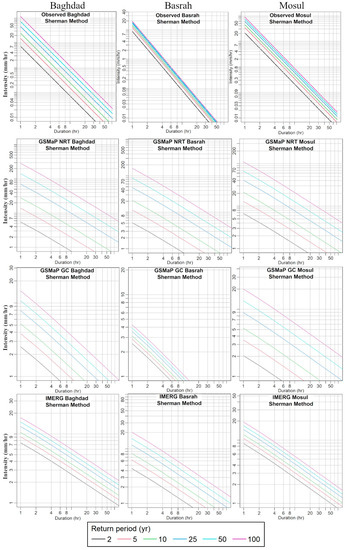 IDF curves at three Iraqi cities using satellite (GSMaP NRT, GSMaP GC, and IMERG) and observed rainfall data from 2000 to 2022 based on the Sherman method.