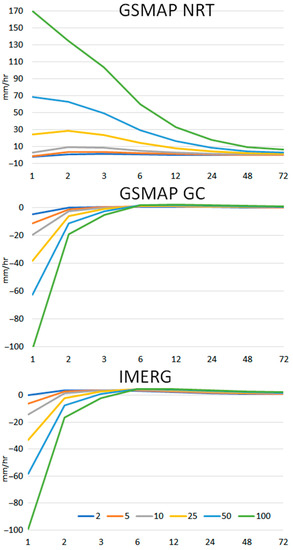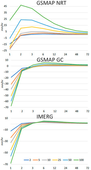 The results were similar at the other two locations. However, the differences were less compared to Baghdad. The difference for GSMaP GC ranged from −15 to 1 at Basrah and −70 to 10 a Mosul. The difference for GSMaP GC was much less than the other two products. This indicates the suitability of GSMaP GC IDF curve to be corrected for reliable estimation of IDF from satellite data.