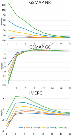 Bias in IDF curves in GSMaP NRT, GSMaP GC, and IMERG data compared to observation at Mosul.