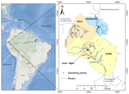 The study took place in Ecuador’s Achupallas parish. The Achupallas parish has an area of 972 km2, located within the southwestern zone of Sangay National Park, Ecuador. We monitored three micro-watersheds (Ozogoche, Juval, and Zula) to assess the water quality of their major rivers and tributaries (Figure 1).