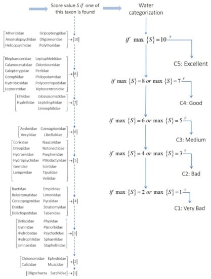 where n represents the total number of taxons present; fi is 1 if the taxon i is present and 0 if it is not. The Pi value is equal to the taxon ABI score given in Table 4. Following the indications of the Water Framework Directive, Ríos-Touma et al. [] defined five water quality classes (Table 5).