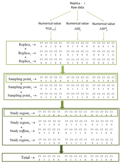 - WQINSF, ABI, and ABI*NC numerical values were transformed into a water quality class for each replicate: C5 or C4 or C3 or C2 or C1, in correspondence with Table 3, Table 5, and Figure 2. The results for each replicate were organized as shown in Figure 3.