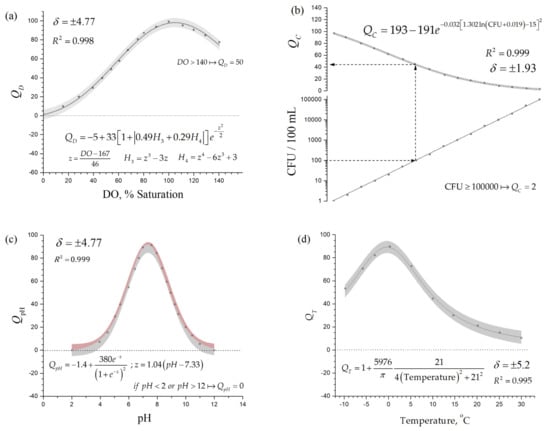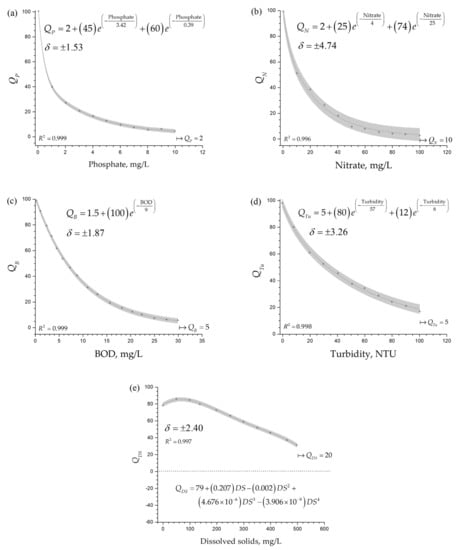 We explored the WQINSF uncertainty by scanning the original plot of the WQI given by Effendy and Romano [] and Otto []. Then, analytical functions were fitted to the numerical values to incorporate uncertainty. The medium quadratic errors associated with each analytical function gave the uncertainty. Finally, we found the uncertainty associated with a given WQINSF value, calculated using the analytical functions of each water quality indicator.