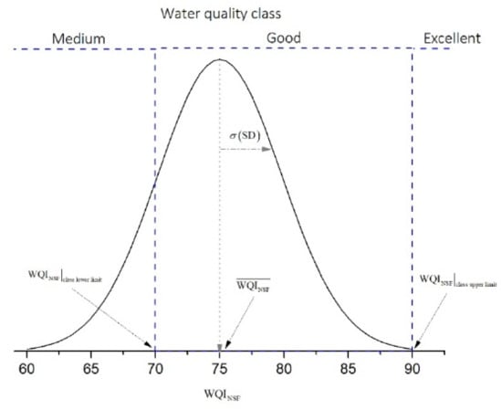 Thus, let us consider that WQINSF is a normally distributed random variable with mean and standard deviation (SD) σ (Figure 6). For clarity, let us consider that the mean values are within the interval suggested in Table 3 for “Good water quality.” Figure 6 shows the upper and lower limits for a “good” water quality class, and