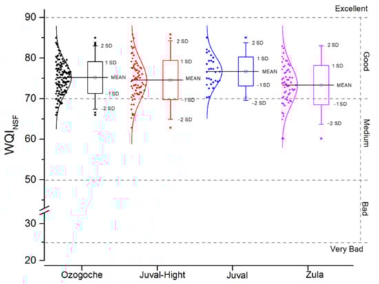 The results in Table 7 show that the mean pH values are between 7.77 and 8.09, considered typical values for high-quality water. Similarly, the average water temperature varies between 10.69 and 11.95; temperatures below 15 °C un-favor microorganism development and intensified odors and flavor. Dissolved oxygen governs most processes that produce or consume oxygen in aquatic ecosystems. Its concentration results from physical, chemical, and biological processes that consume oxygen. The results obtained vary between 6.68–7.50 mg L−1 of dissolved oxygen. Thus, the dissolved oxygen is adequate for the growth and development of aquatic organisms. The electrical conductivity (EC) for good quality natural waters should be between 50 and 1500 µS cm−1. However, the sampled waters of the study area are within the lower range of 105.93 µS cm−1. The highest turbidimetry measurements, above the WHO’s 5 NTU limit [], were found in the Juval-Hight and Zula micro-watersheds; these results demonstrate the sediment-dragging effects of surface runoff from rain. The Juval-Hight and Zula micro-basins show the greatest EC values. The same behavior was observed for dissolved solids, although all the average values are within the permissible range (500 mg L−1). Thus, the mean water quality characterized by the WQINSF is good. This result suggests significant water quality changes began due to environmental degradation and contact with domestic and agricultural wastes [,,].