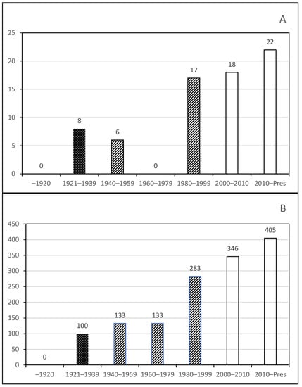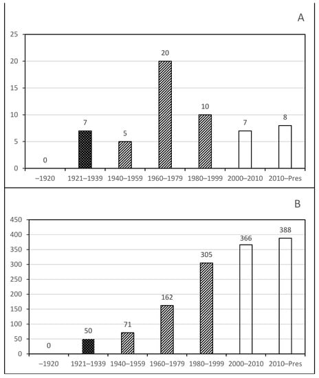 Following the comprehensive analysis of the available specialized literature, we divided the zooplankton studies in Mexico into three historical periods: the first comprised the XIX century to the 1940s decade in the XX century, the second period was from the early 1950s to the end of the 1990s of the XX century, the third period started from the year 2000 to date. The rise in publications coverage and the increased number of species reported (Figure 1, Figure 2, Figure 3, Figure 4 and Figure 5) are markers of the progress in discovering the Mexican zooplankton biodiversity. In the following paragraphs, we provide details of each phase. Additionally, in the Supplementary Table S1, we include the number of species for each group and further bibliographic information regarding them.
