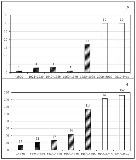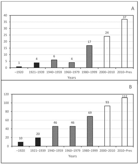 Historical progress of studies on Mexican Rotifers. (A) Number of publications (B) Cumulative species recorded in this region.