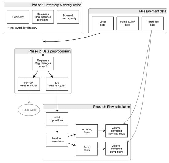 The methodology proposed in this paper consists of three phases, as shown in Figure 1: (1) an inventory of the configuration and the operational modes of the pumping station; (2) a data preprocessing phase; (3) an iterative calculation of average incoming and outgoing flows for all dry weather cycles. In the following paragraphs, the different phases are explained in more detail.