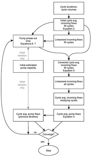 Corrected values of can now be compared to the previously calculated value, which, in the first iteration, is equal to the initially estimated nominal pump capacities. If the difference for each pump is within a preset tolerance, no further iteration is required. If not, the new values of are used as input for a new calculation of the pumps’ phase-out times, which will then again be used in Equation (8) to calculate new corrected incoming flows, until convergence for is achieved.