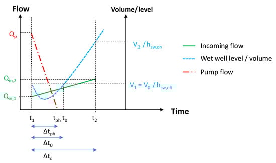 Assuming (i) a linear decrease in the pump flow between of the past emptying cycle at switch-off time t1 and zero flow at the (still unknown) time tph (=t1 + Δtph) and (ii) a linear variation of the incoming flow between Qin,1, at switch-off time t1, and Qin,2, at switch-on time t2, with the cycle duration ∆tc = t2 − t1, Δt0 can be calculated as:
