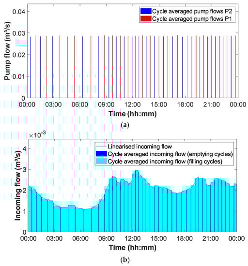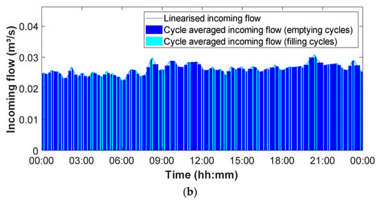 The incoming flows during filling cycles, as calculated from Equation (2), are average values over the duration of the cycles, whereas, in reality, flows are a continuous function of time. Assuming that dry weather flows will generally not show sudden variations over the relatively short duration of a pumping cycle, a linearisation of the average values is proposed to create a more continuous transition between successive cycles.
