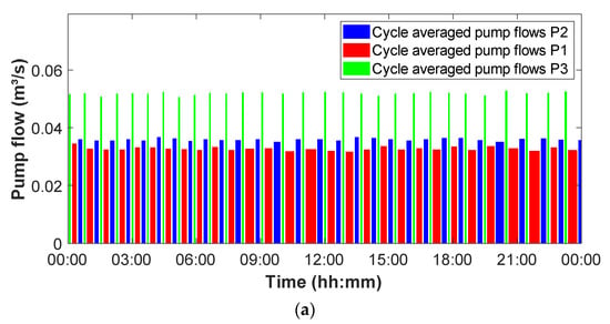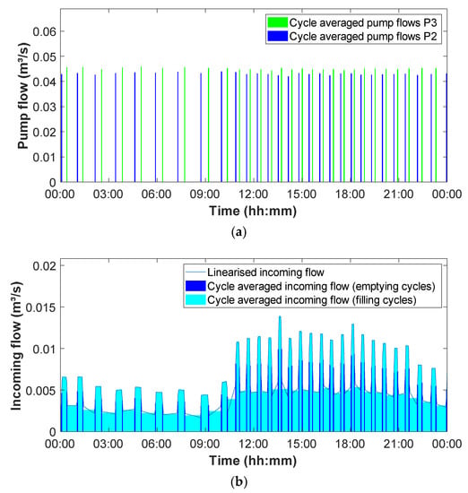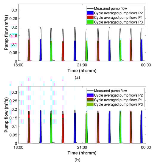 In Figure 8 on the other hand, there is a clear discrepancy between the calculated pump flows and the calculated incoming flows. The pump flows—as expected from the available pump curves—are very similar for both pumps. The incoming flows, however, show significantly different values for the different cycles, depending on which pump was active. In this case, after an investigation on-site, there appeared to be a problem with the wiring of a provisional datalogger. This resulted in one of the pumps failing to log its switches, although it was operating normally. Because of the regular alternation of the three pumps, this did not result in the erroneous identification of regimes and regime changes. However, the calculated cycle duration for the cycles preceding the non-logged ones was not reflecting the real cycle duration and, therefore, yielded lower calculated average cycle flows. Note that in this case, the calculated flows for P2 and P3 are only around two-thirds of the expected value (69 L/s). Additional measurements have to clarify whether this is due to an underestimation of the control volume or if the pumps are not reaching their envisaged capacity.