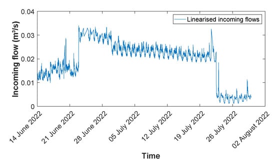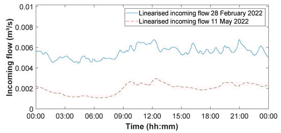 Using again the linearisation procedure on the corrected values of , corrected linearised incoming flows for the emptying cycles can now also be calculated (as shown in Figure 4), and from these, corrected values of and, using Equation (3), corrected values of for each pump are obtained.