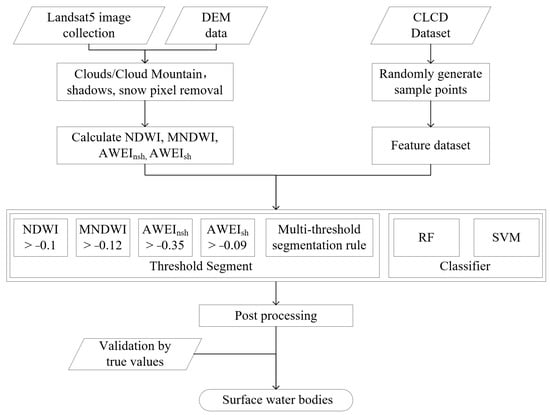 Technical flow chart. RF, random forest; SVM, support vector machine; CLCD, China Land Cover Dataset; NDWI, normalized difference water index; MNDWI, modified normalized difference water index; , automated water extraction index with shadows elimination; , automated water extraction index with no shadows elimination.