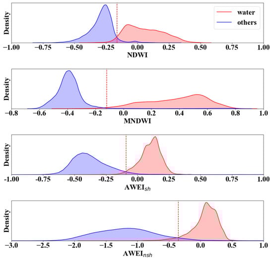 To explore the water index segmentation threshold, the remote-sensing indices of training sample points were calculated, and a density map is shown (Figure 3). We only extracted water bodies; non-water bodies were uniformly classified into others.