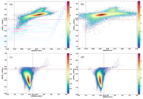 Based on the algorithm proposed by Zou et al. [] and Deng et al. [], this study firstly calculated the remote-sensing index of sample points, drew the scatter density map of water and non-water bodies (Figure 4) and determined the segmentation threshold according to the scatter density map.