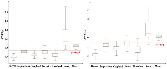 Training samples are concentrated in the first quadrant separated by the red dotted line, and the non-water body samples are concentrated in the third quadrant (Figure 4). The method misidentified 4.69% of water bodies as non-water bodies and 3.97% of non-water bodies as water bodies. To remove misclassified non-water bodies from water bodies, we used the AWEI index for threshold segmentation. To compare the differences between water bodies and other ground objects in the and , we drew a box plot (Figure 5). Except for snow, water bodies had good separability from other ground objects. When > −0.15 and > −0.52 were satisfied, the MFTSA method had a good effect on suppressing mixed-pixel and shadow noise. Finally, the MFTSA method (( > −0.15 and > −0.52) and () > −0.18 and (MNDWI-EVI > −0.25 or MNDWI-NDVI > −0.25)) was used to make a small-water-bodies map based on Landsat TM5 data of the Loess Plateau.