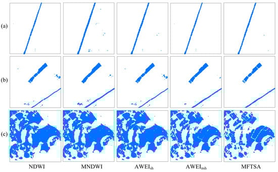 Study area (a) was a small ditch of uniform width. As shown in Figure 6, the MNDWI and methods identified some non-water pixels as water pixels around the ditch, and the two methods identified different ditch widths. By contrast, other methods could identify water body information more accurately. Study areas (b) and (c) were ponds. The NDWI, MNDWI, and had difficulties identifying the boundary between ponds, which led to fuzzy boundaries of ponds in the identification result. However, the MFTSA method showed clear pond boundaries and complete extraction of small water bodies. To quantitatively evaluate the influence of different remote-sensing indexes on small-water-bodies extraction, experimental datasets were used in this study to evaluate the accuracy of different methods. The correct extraction results and accuracy of different methods on the test dataset are shown in Table 3 and Table 4, respectively.