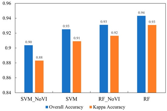 The vegetation index can enhance vegetation information, and the water body index can identify water body information. Adding the vegetation and water body indices to the feature dataset helps a classifier identify objects better [,]. In order to compare the effects of adding remote-sensing indices (MNDWI, EVI, NDVI and AWEI) on the classification of water bodies, we designed two sets of experiments, without indices and with indices, to explore whether adding these index features could improve the classification accuracy.