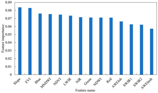 As shown in Figure 8, the importance of Slope, EVI and Blue features was relatively high, which was mainly related to samples. The top three samples in the dataset were grassland, water and cultivated land. The three land cover types were all sensitive to slope, while grassland and cultivated land were sensitive to EVI, and the blue band was sensitive to water bodies. Therefore, the Slope, EVI, and Blue features were more important. Although was sensitive to water bodies, it was difficult for this index to distinguish grasslands, woodlands and cultivated land, so the importance of features was relatively low.