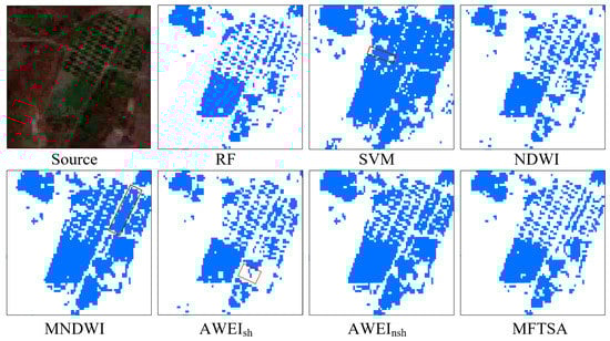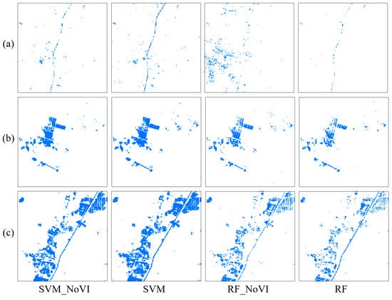 Three typical study areas including small water bodies were selected for comparative analysis on the classification results of machine learning. The extraction results of the three typical study areas are shown in Figure 9.