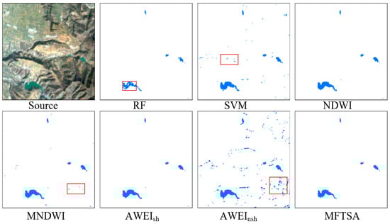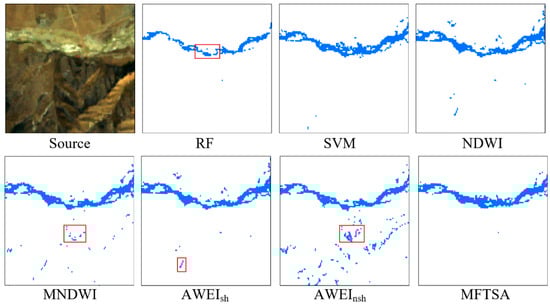 There are hill shadows between mountains. Although we used slope information to remove the hill shadows, it could only remove the hill shadows on the larger slopes. In some mountainous areas with smaller slopes, the effect of removing hill shadows was not good enough. As shown in Figure 13, the extraction results of the RF method leaked a part of the water body in the red frame, resulting in holes in the pond; SVM, MNDWI and recognized some mountain shadows as water bodies, and had the most serious misrecognition phenomenon, mainly because the index was suited for scenes without shadows. eliminates shadow pixels that are easy to confuse with water bodies in the result of , so the effect of extracting water bodies is better. On the whole, the NDWI, and MFTSA methods were better in extracting small water bodies in mountainous areas.