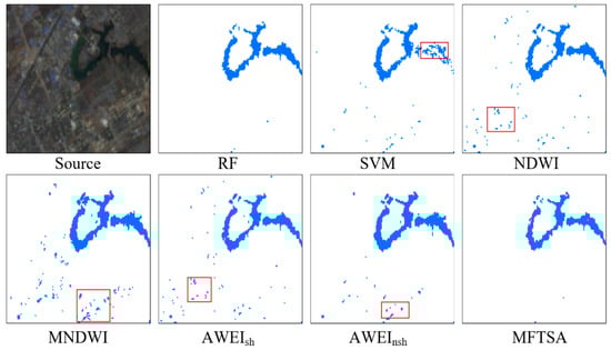 In urban areas, artificial building information is the dominant background information. The reflection of buildings is strong, while the reflection of water bodies is weak (Figure 12). Therefore, large background buildings and building shadows strongly interfere with water body extraction. The SVM method extracts water bodies incompletely. SVM seldom misses water bodies’ pixels in other scenes, but it misses water bodies in small urban reservoirs. The main reason is that small water bodies in cities appear black, and the spectral characteristics of water bodies in other places are not consistent. NDWI, MNDWI, and are relatively complete in extracting water bodies, but there are varying degrees of false extractions. Therefore, the RF and MFTSA methods are better in the identification of small urban water bodies.