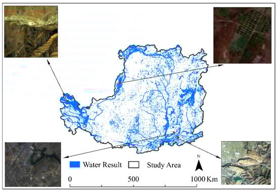 Due to the abnormal value of the image pixels, the water body extraction result inevitably has a small range of noise. Therefore, it was necessary to further process the extraction results to get the final result. Firstly, the water extraction results were converted from the raster format to the vector format, and then the Aggregate Polygon operation was carried out in ArcgisPro2.5. The reason for executing the Aggregate Polygon operation was that in the conversion process of water extraction results, some water bodies were divided into several small water bodies, which needed to be aggregated into one water element. We set the Aggregation Distance to 60 m, and then multiple water elements with a distance of less than 60 m were aggregated into one water element. Due to the limitation of image resolution, it was difficult to identify particularly small water bodies (<100 m2), so these water bodies were not included in the statistics. In the aggregation operation, Min Area and Min Hole Size were set to 100 m2, bodies of water less than 100 m2 in area were removed, and holes less than 100 m2 between vector bodies of water were filled as bodies of water. In order to compare the effects of different methods for extracting small water bodies, four regions (small rivers, aquaculture water, small urban reservoirs and small ponds in mountainous areas) were selected for comparative analysis.