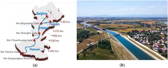 Main canal of the middle route of the South-to-North Water Diversion Project: (a) general layout and (b) canal and crossing water-conveyance structures.