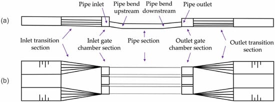 The 158 crossing water-conveyance structures include 102 inverted siphons, 27 aqueducts, 17 underdrains, and 12 culverts. Each structure consists of an inlet transition section, an inlet gate chamber section, a main structure section, an outlet gate chamber section, and an outlet transition section, with a design roughness coefficient of 0.014 (Figure 2, an example). There are 61 control gates in total, with an average spacing of about 20 km, of which 59 are arranged in combination with the crossing water-conveyance structures and located at the inlets of aqueducts, culverts, and underdrains and at the outlets of inverted siphons.