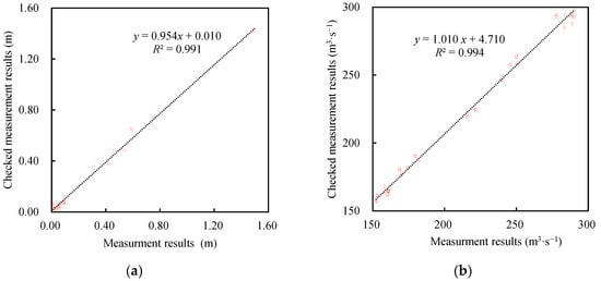 The measurement results offered by the field management stations in the project and the checked measurement results from researchers in this study are compared in Figure 4. The analysis shows that the two sets of results were generally in good agreement. The water levels measured in the project had random errors with deviations in the range of ±0.10 m. The flow rates measured in the project had overall relatively small systematic errors with deviations of less than 7.2%. Based on the examined measurement data, the flow rate correction equation in Figure 4b was fitted to correct the measured flows in the project.