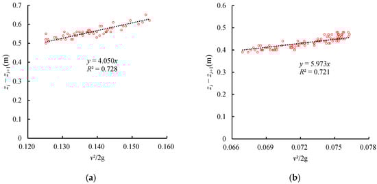 The relationship between the water level difference between the inlet and outlet and the velocity head of the characteristic section (i.e., zi − zi+1 and v2/2g) of each structure was plotted according to Equations (6) and (9) and the slope of the linear fitting curve was ζ. The relationships between zi − zi+1 and v2/2g for the inverted siphon in the Baihe River and the aqueduct in the Caohe River are plotted as examples in Figure 5a,b, respectively, and the corresponding ζ values were 4.05 and 5.97.