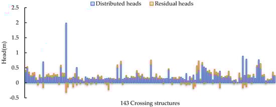 The distributions of distributed heads and residual heads of the 143 crossing water-conveyance structures of the Main Canal are shown in Figure 6 in the order of upstream to downstream. There were 103 (72%) structures with surplus distributed heads and 40 (28%) structures with excess head losses. There were 31 inverted siphons with excess head losses, accounting for 30% of the total number of inverted siphons, with an average excess of 0.07 m and a maximum excess of 0.17 m; four aqueducts with excess head losses, accounting for 15% of the total number of aqueducts, with an average excess of 0.15 m and a maximum excess of 0.32 m; four underdrains with excess head losses, accounting for 24% of the total number of underdrains, with an average excess of 0.04 m and a maximum excess of 0.11 m; and one culvert with excess head loss, accounting for 8% of the total number of culverts, with an excess of 0.07 m.
