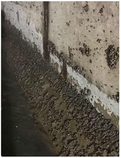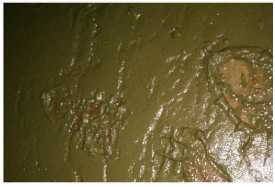 (3) Sediments at bottom of structure. The Main Canal draws water from the Danjiangkou Reservoir, and there is very little silt from the water source. However, during the flood season, external floodwaters overflow into the canal through the drainage structures on the left bank many times, resulting in different degrees of sedimentation near some structures [,]. An investigation in 2017 showed that the flood control risk of 31 of the 73 drainage structures on the left bank along the Main Canal did not meet the design requirements, and overflow could cause external water to enter the canal under flood conditions far below the design standard []. According to the survey of the 72-km section at the end of the Main Canal from 2019 to 2020, the main types of sediments were silts, algal residues, fallen leaves, freshwater mussels, and other miscellaneous materials, which were mainly distributed in areas with gentle flow velocities, such as canal bends, water diversion areas, and before exit gates. The sediments had an average thickness of 0.2–0.3 m, and some were as high as 1–2 m; the sediments in inverted siphons had a thickness of about 0.02 m, mainly composed of algal residue sediments (Figure 8) and small quantities of miscellaneous materials such as water bottles, plastic bags, and garbage, rather than silt []. The research and development of environmentally friendly underwater dredging equipment suitable for the Main Canal and regular dredging have become urgently needed to improve the water-conveyance capacity of the Main Canal [].