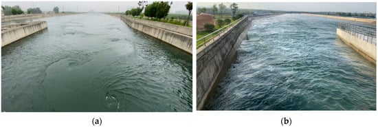 Flow regime at the outlet: (a) the aqueduct of the tributary of the Shuangji River and (b) the aqueduct of the Lihe River.