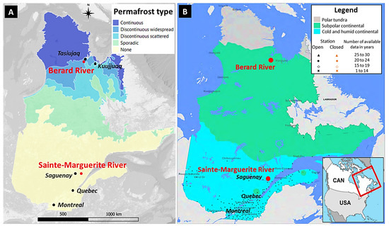 The Sainte-Marguerite River is in the south of the province, without permafrost (Figure 1A) and in a continental cold and humid climate (Figure 1B) with an annual average temperature of 3 °C and an average annual precipitation of 980 mm. The Berard River is in the northern part of the province, in a discontinuous permafrost zone (Figure 1A) and in a continental subpolar climate (Figure 1B) with an annual average temperature of −5.2 °C and an average annual precipitation of 447 mm [33].