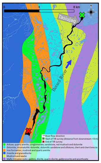 The Berard River study site covers 17.5 km downstream of Berard Lake to the river’s mouth in Ungava Bay (Figure 3). The bedrock geology across the Berard River is a mix of sedimentary rocks dominantly made of conglomerate, sandstone, siltstone, mudrock, wacke and quartz arenite. Near the bay and further from the river valley, igneous rocks dominantly made of gabbro, diorite, quartz diorite, gabbronorite, anorthosite, granite and granodiorite are also present (Figure 3). Some bedrock formations contain a considerable amount of iron (orange in Figure 3). Based on field observation, the shallow aquifer below the Berard River is made of recent alluvium. From 0 to about 0.75 m depth, a hardpan with boulders and rocks with a diameter of 1 cm to >50 cm is present. Low-permeability deep-water fine-grained glaciomarine sediment is present underneath the shallow alluvial aquifer [36].