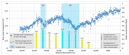Identifying the exact source of cold water for these larger cooling zones by relying on TIR imagery alone can be difficult [18], and the exact sources of cooling water inputs have rarely been the subject of previous TIR-based studies (e.g., [15,19]). Thus, the hypothesis of consistently higher GW seepage in large cooling zones remains unverified. The present study combines the use of 222Rn (henceforward referred as radon) as a natural tracer for the detection of GW in the river cooling zones to overcome the limits of the TIR imagery method in validating this hypothesis.