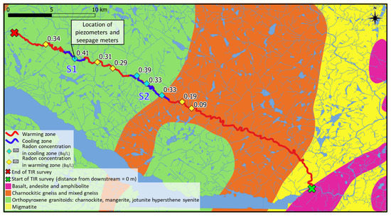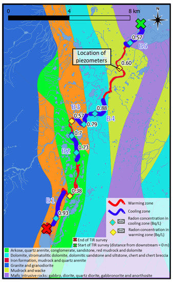 The assumption was that a higher measured radon concentration is present in the cooling zone since there is a discharge of radon/uranium-rich GW with a lower temperature. However, the higher measured radon concentration could be due to a higher radon content in the bedrock [44,45]. To verify if this was not the case, the type of bedrock at each sampling point in the river was evaluated.