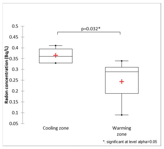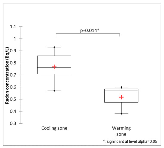 Box and whisker plot of radon concentration for cooling and warming zones of Berard River showing significant difference at 95% confidence level t-test.