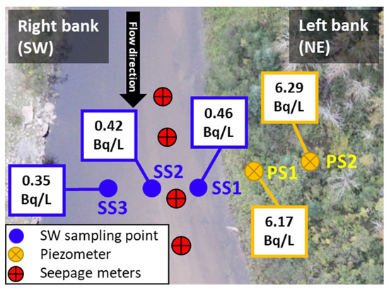 The radon concentration in the piezometer further from the river (PS2 in Figure 12) was higher than the one close to the river (PS1 in Figure 12), which is prone to dilution and mixing with SW. Moreover, the radon concentration in the river from SS1 to SS3 decreases. This shows that GW seepage reduces by moving from the left riverbank to the right riverbank.