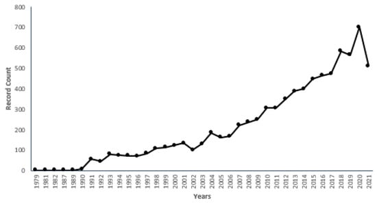 Figure 1 indicates the total number of documents related to the impacts of climate change on heavy metal contamination in coastal areas that were published between 1979 and 2021, according to the WOSCC database. The total number of publications was 7922, with the number of publications increasing over the years. Publications on this topic first emerged in 1979 (with only one article) but remained scarce until 1990 (in the range of 1–7 articles). Due to the noticeable increase in awareness of the impacts of climate change on heavy metal contamination in coastal areas in the early 1990s, the number of publications started to increase from 1991 (55 articles) and continued to steadily increase over the years until recently. From 1998 to 2006, the number of publications averaged 136 articles per year, while from 2007 to 2009, it averaged 236 articles per year. From 2010 to 2019, the number of publications increased steadily, ranging from 305 to 564 articles per year. In 2020, the number of published articles was at its highest (701 articles), but the number reduced in 2021 (510 articles).