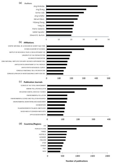 The top 10 contributors of studies related to the impacts of climate change on heavy metal contamination in coastal areas, based on the Web of Science Core Collection database (1979–2021): (a) authors; (b) affiliations; (c) publication journals; (d) countries.