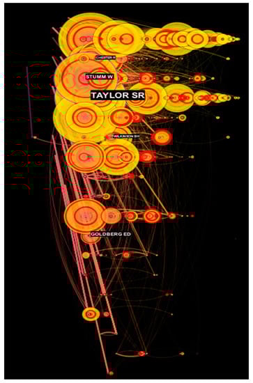 According to our scientometrics analysis, the top three most cited authors with the highest centrality were S. R. Taylor (0.18), W. Stumm (0.10) and E. D. Goldberg (0.10) (Figure 3). S. R. Taylor is a geochemist and planetary scientist who has worked on a wide variety of topics within trace element geochemistry, including the composition and evolution of the moon, the continental crust, tektites, impact glasses and island arc rocks []. He has 200 publications listed in the WOSCC database, with 22,073 citations in 17,890 documents []. Taylor [] also stated that he has published 10 books and 240 papers in scientific journals. W. Stumm is also a geochemist and he has published 202 documents, with 15,905 citations in 11,760 documents in the WOSCC database. His most citated publication was published 1970, with the title “Acidic Mine Drainage: The Rate-Determining Step”, which had 1248 citations recorded in the WOSCC database. This article stated that the rate-determining step in the oxidation of iron pyrite and the formation of acidity in streams is associated with coal and copper mines []. E. D. Goldberg is a marine chemist who is known for his studies on pollution in the oceans, including trace elements and heavy metals. He has 250 publications recorded in the WOSCC database, with 5340 citations in 4494 articles, excluding self-citation []. The top three authors mainly published articles on the impacts of trace elements or heavy metals on marine and/or sediment habitats rather than articles that were directly related to climate change.